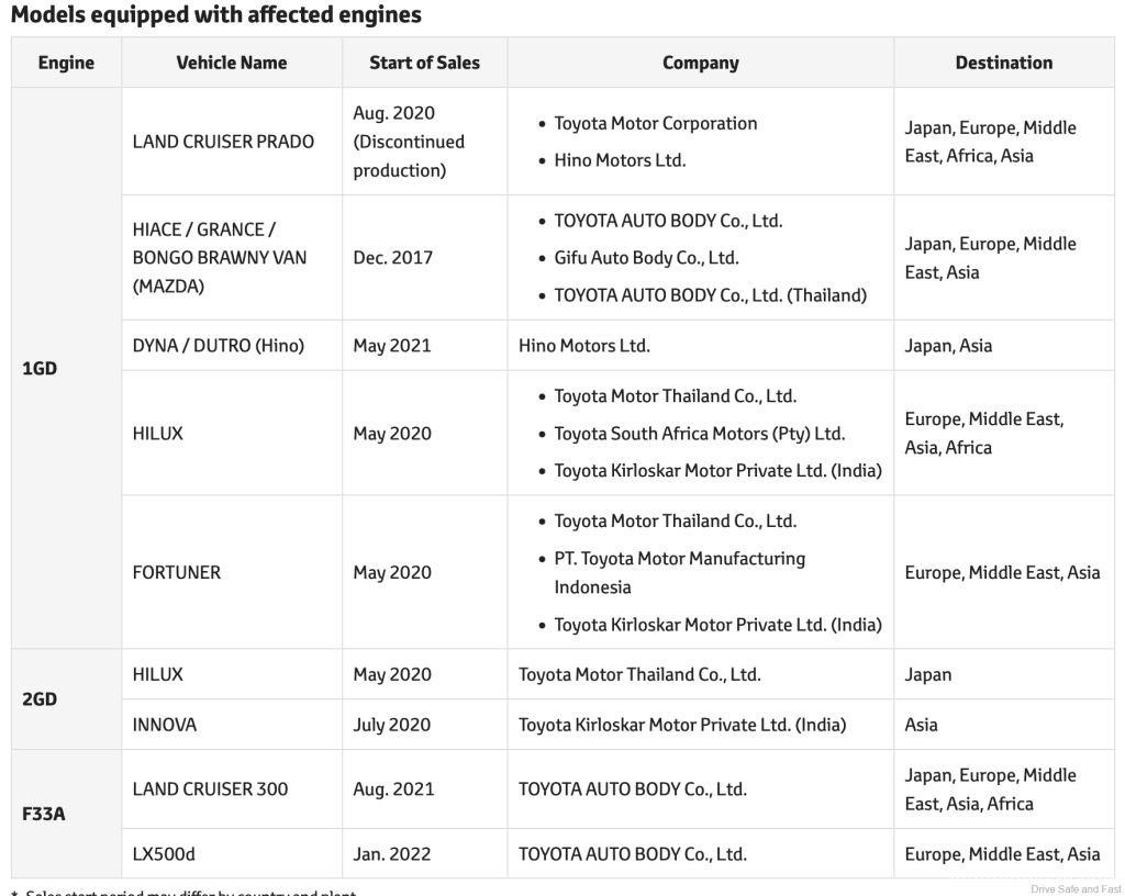 Toyota mengupah penyiasat bebas yang menemui tiga enjin diesel buatan Toyota Industries Corporation (TICO) mempunyai penyelewengan. Enjin 1GD, 2GD dan F33A ini dipasang dalam pelbagai produk, daripada Hilux kepada model Fortuner, Land Cruiser dan Lexus LX yang lebih premium.