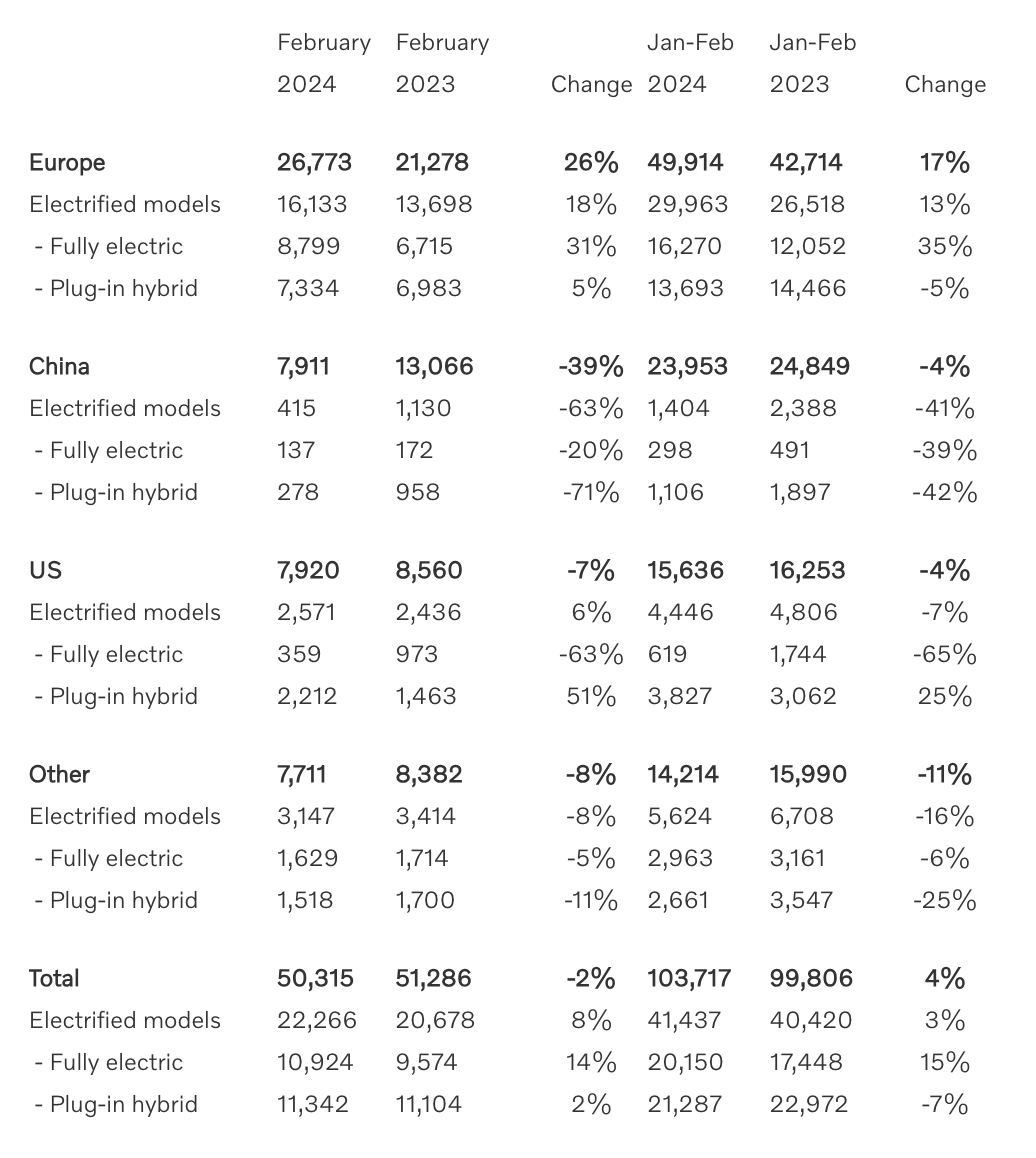 Di Eropah, jualan meningkat sebanyak 26 peratus, dengan model elektrifikasi mencatatkan pertumbuhan sebanyak 18 peratus. Secara khusus, penjualan kereta elektrik sepenuhnya melonjak 31 peratus berbanding bulan yang sama tahun lalu. Di sebalik penurunan keseluruhan di China sebanyak 39 peratus, pertumbuhan ini memberi gambaran positif mengenai penerimaan pasaran terhadap teknologi elektrifikasi.