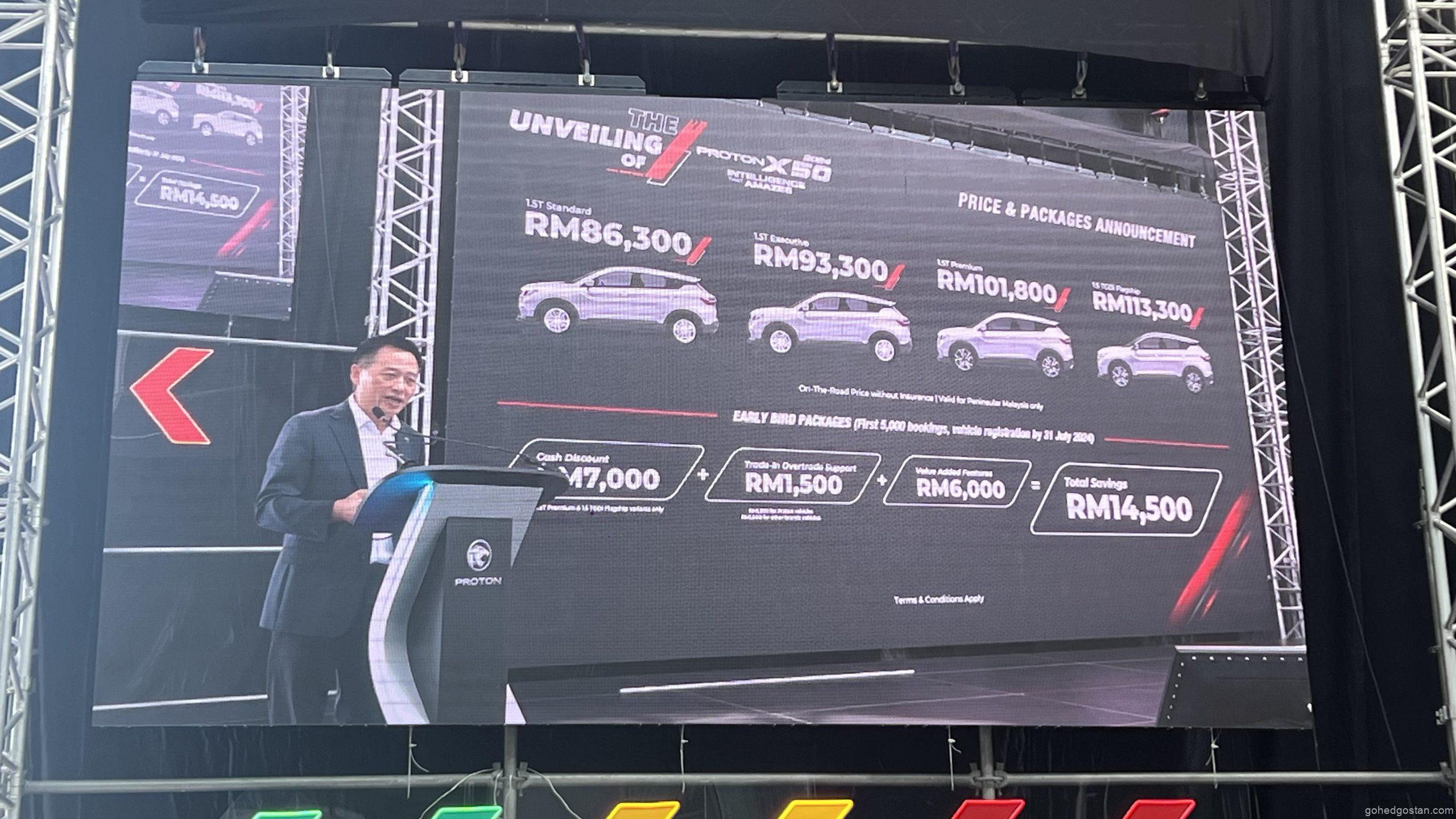 • 2024 Proton X50 1.5T Standard: RM86,300 (Semenanjung Malaysia), RM88,300 (Malaysia Timur)