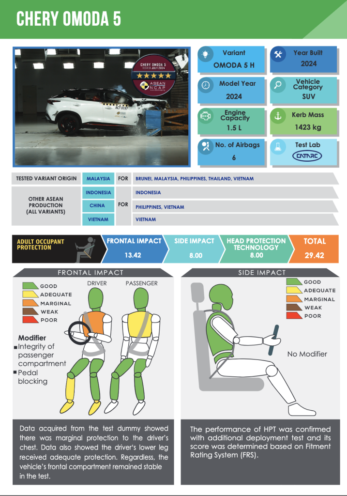 Satu lagi aspek penting yang dinilai oleh ASEAN NCAP adalah struktur badan kenderaan. Struktur badan yang kukuh adalah kunci untuk melindungi penumpang dalam kes pelanggaran. Chery OMODA 5 berjaya melepasi ujian ini dengan cemerlang, membuktikan bahawa kenderaan ini direka untuk menahan impak yang kuat tanpa menjejaskan keselamatan penumpangnya. Ini adalah sesuatu yang perlu diambil kira oleh pengguna, terutamanya apabila memilih kenderaan untuk keluarga.