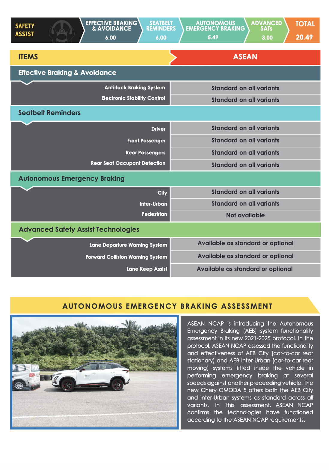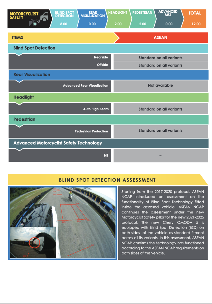 Satu lagi aspek penting yang dinilai oleh ASEAN NCAP adalah struktur badan kenderaan. Struktur badan yang kukuh adalah kunci untuk melindungi penumpang dalam kes pelanggaran. Chery OMODA 5 berjaya melepasi ujian ini dengan cemerlang, membuktikan bahawa kenderaan ini direka untuk menahan impak yang kuat tanpa menjejaskan keselamatan penumpangnya. Ini adalah sesuatu yang perlu diambil kira oleh pengguna, terutamanya apabila memilih kenderaan untuk keluarga.