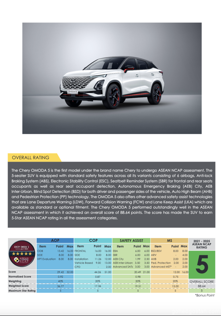 Chery OMODA 5 sekali lagi mencuri perhatian dalam dunia automotif apabila berjaya meraih penarafan 5 Bintang dari ASEAN NCAP. Ini bukanlah pencapaian yang mudah, memandangkan protokol penilaian yang digunakan oleh ASEAN NCAP pada kali ini lebih ketat dan komprehensif, mengikuti garis panduan 2021-2025. Skor keseluruhan sebanyak 88.64 mata yang dicapai oleh OMODA 5 adalah satu bukti nyata bahawa Chery telah berjaya menghasilkan sebuah kenderaan yang tidak hanya menarik dari segi reka bentuk, tetapi juga selamat untuk dipandu.