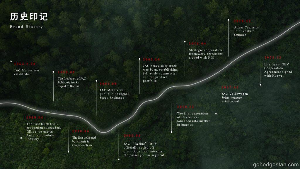 Perjalanan JAC Motors bermula dengan pengeluaran trak pertama pada tahun 1968, yang menjadi asas kepada kejayaan syarikat ini dalam kenderaan komersial. Pada tahun 1990-an, JAC memperluaskan perniagaannya dengan mengeksport trak ke pasaran antarabangsa seperti Bolivia dan memperkenalkan inovasi baharu di China, termasuk casis bas khusus pertama di negara itu.
