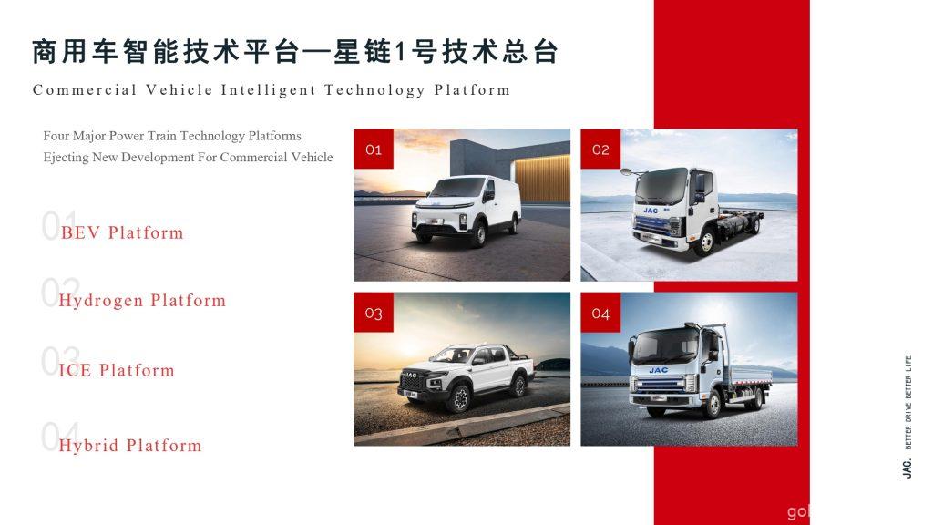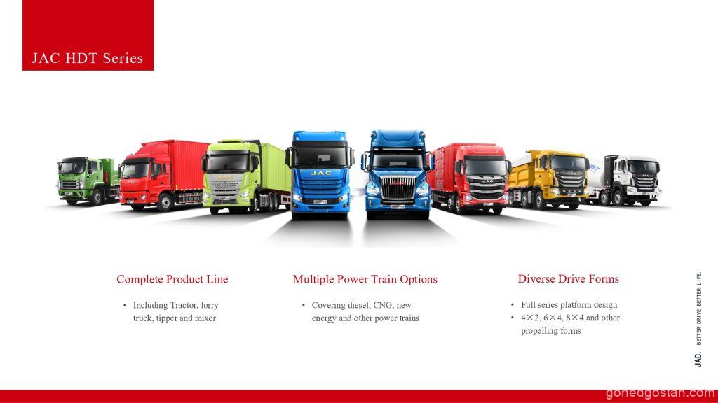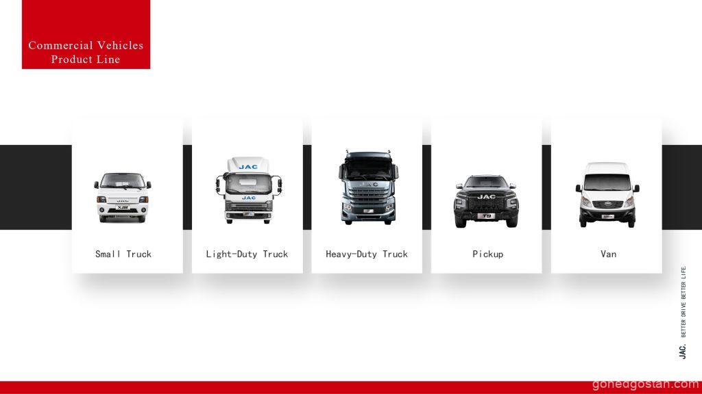 Walaupun JAC Motors telah mempelbagaikan pengeluaran ke dalam kereta penumpang dan kenderaan tenaga baharu (NEV), kenderaan komersial masih kekal sebagai tunjang utama perniagaan mereka. Barisan kenderaan komersial JAC merangkumi pelbagai keperluan pasaran, dari trak penghantaran kecil hingga kenderaan tugas berat yang direka untuk penggunaan industri dan pembinaan. Teknologi penggerak yang pelbagai seperti enjin pembakaran dalaman (ICE), kenderaan elektrik berkuasa bateri (BEV), trak berkuasa hidrogen, dan sistem hibrid mempamerkan keupayaan JAC untuk menyesuaikan diri dengan perubahan peraturan alam sekitar dan permintaan pasaran.