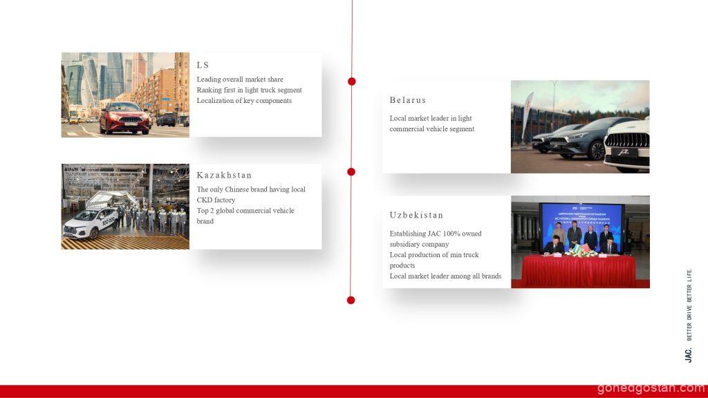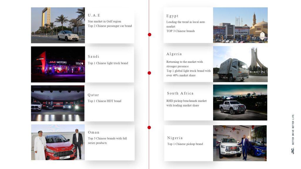 Selain daripada kemudahan pengeluaran domestik, JAC mempunyai kehadiran antarabangsa yang kukuh dengan 19 kilang CKD (Completely Knocked Down) di luar negara dan operasi di lebih 130 negara. Jejak global ini membolehkan JAC menembusi pasaran baharu dan memenuhi keperluan pelbagai pangkalan pelanggan, daripada armada penghantaran bandar di Eropah hingga penyelesaian pengangkutan industri di Afrika dan Asia.