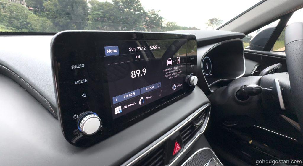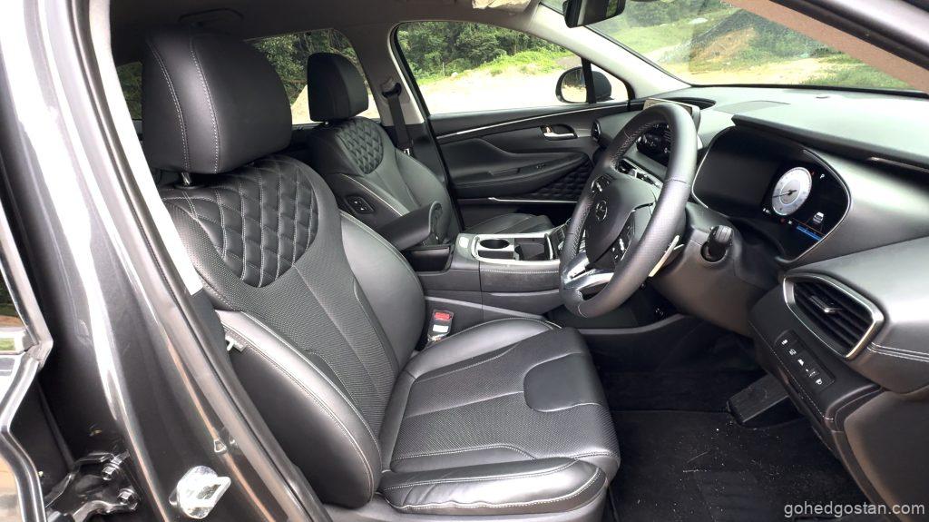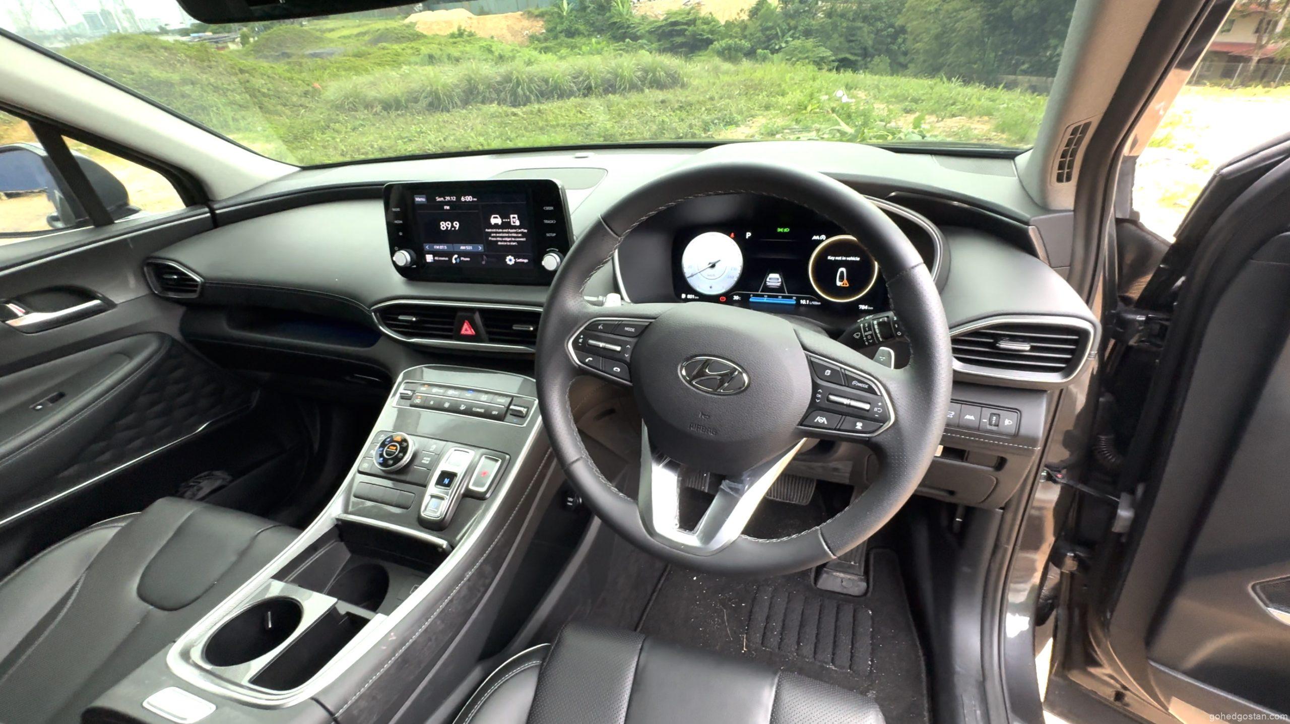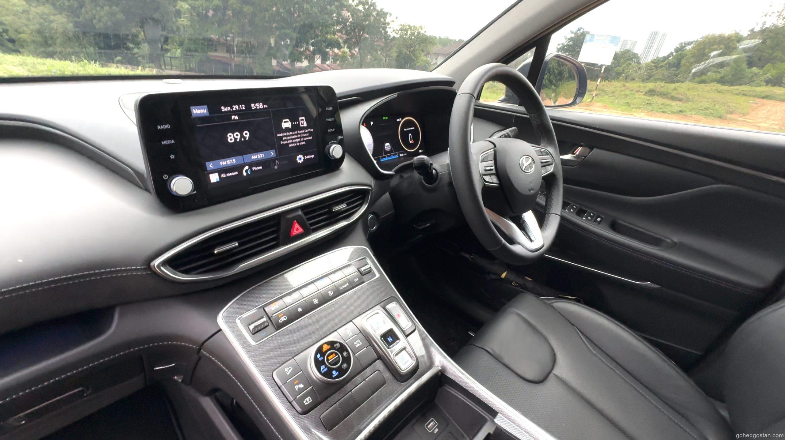 Bila masuk ke dalam kabin, terasa betapa luasnya ruang dalaman Santa Fe. Tempat duduk balutan kulit sintetik, panel digital 12.3 inci, serta infotainmen skrin sentuh 10.25 inci yang menyokong Apple CarPlay dan Android Auto tanpa wayar menjadikan pengalaman dalam kabin lebih premium.