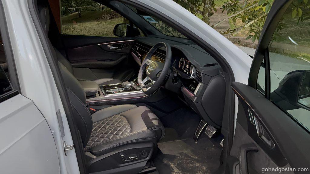 Q7 tampil dengan dimensi besar dan garisan tajam yang jelas menzahirkan statusnya. Lampu Matrix LED memberi wajah moden, rim 22 inci pula menambah karakter teguh. Warna Glacier White yang kami pandu menampakkan kesan bersih, namun ketika perbualan ringan bersama anak-anak, pilihan warna lain turut dibahaskan. Julisha gemarkan Waitomo Blue kerana lebih fotogenik, Zack pula lebih cenderung kepada Mythos Black kerana nampak “serius”, manakala Aida menganggap Daytona Grey lebih praktikal.