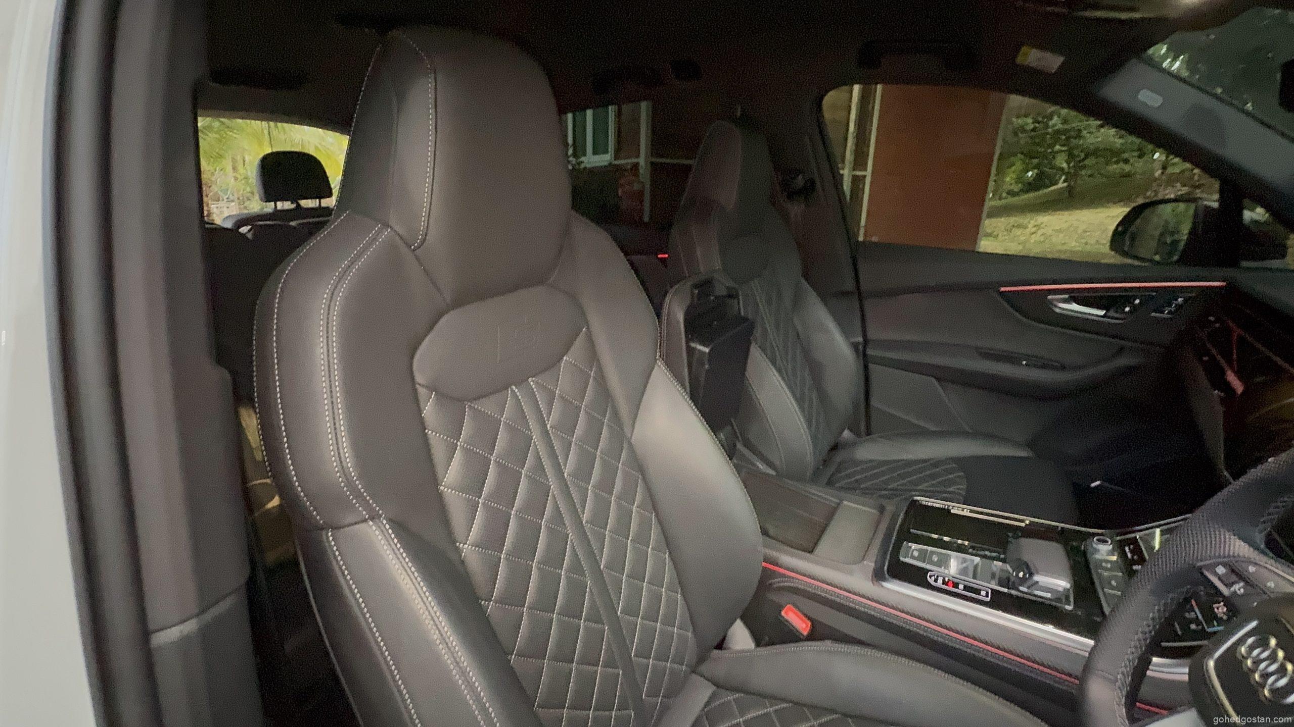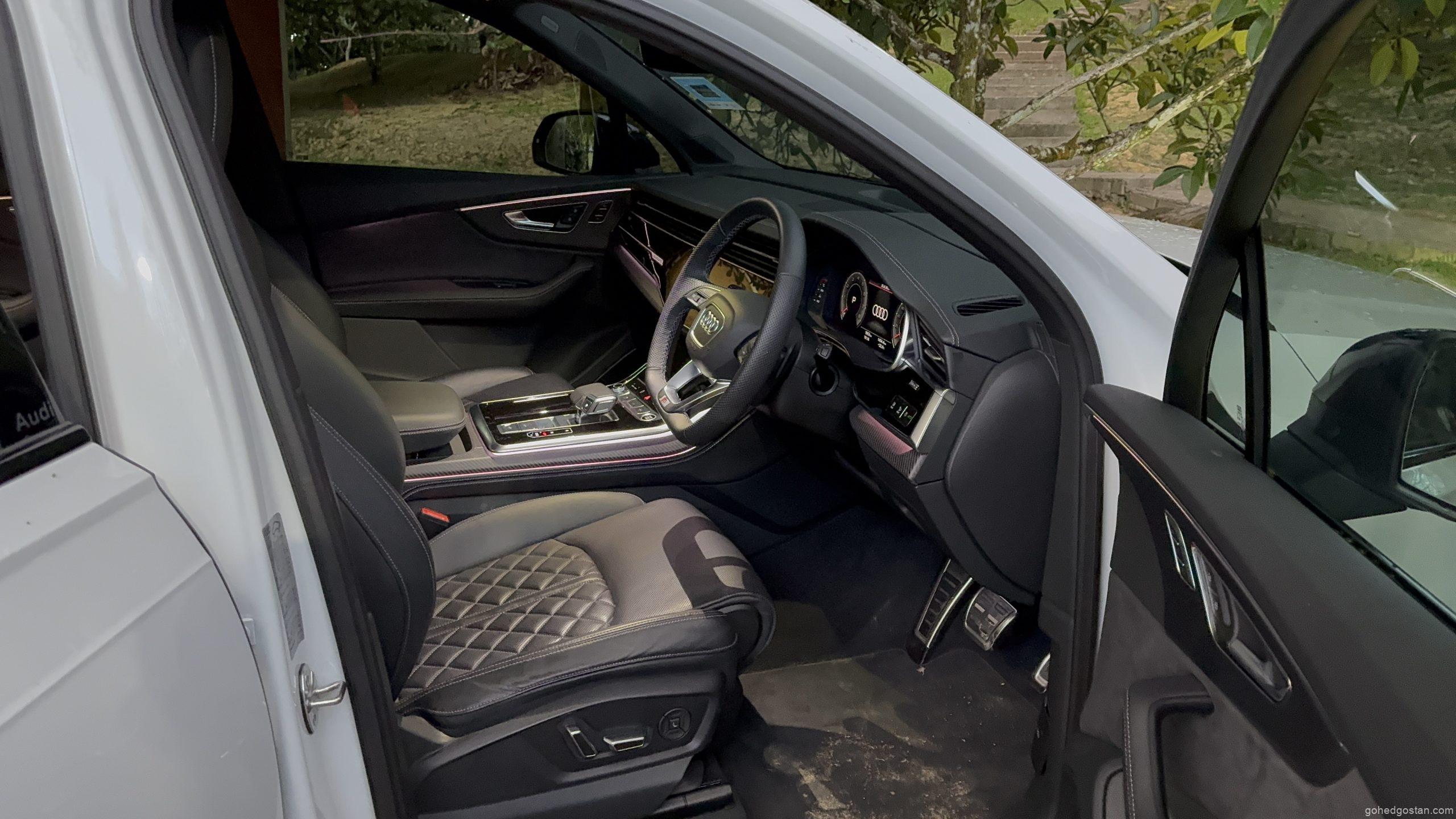 Q7 tampil dengan dimensi besar dan garisan tajam yang jelas menzahirkan statusnya. Lampu Matrix LED memberi wajah moden, rim 22 inci pula menambah karakter teguh. Warna Glacier White yang kami pandu menampakkan kesan bersih, namun ketika perbualan ringan bersama anak-anak, pilihan warna lain turut dibahaskan. Julisha gemarkan Waitomo Blue kerana lebih fotogenik, Zack pula lebih cenderung kepada Mythos Black kerana nampak “serius”, manakala Aida menganggap Daytona Grey lebih praktikal.