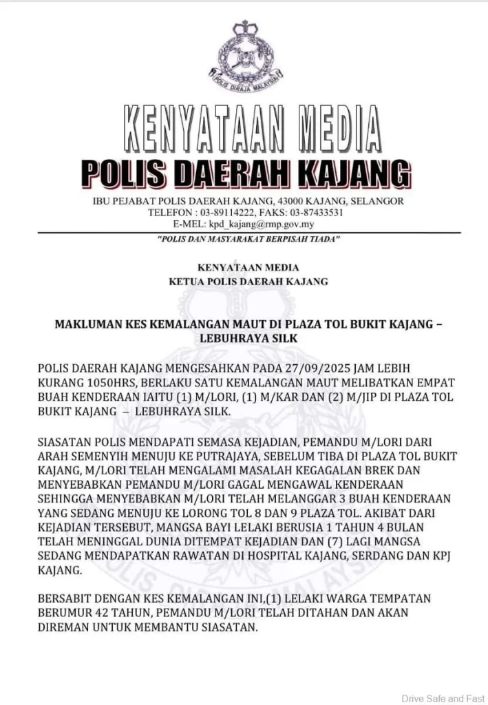 Sabtu lalu, suasana di plaza tol Bukit Kajang bertukar menjadi kecoh apabila sebuah lori tiga tan yang membawa barangan lusuh gagal membrek dan merempuh Nissan X-Trail milik JKR, sebuah Honda City dan Proton X70. Perlanggaran itu mengakibatkan seorang bayi lelaki berusia 12 bulan meninggal dunia, manakala lapan yang lain cedera.