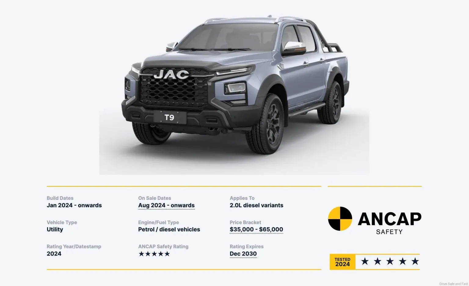 Dari aspek keselamatan, JAC T9 benar-benar menyerlah. Ramai pembeli menyangka trak pikap sememangnya selamat kerana saiznya, tetapi itu satu tanggapan salah – binaan ladder-frame tidak semestinya menjamin perlindungan struktur.