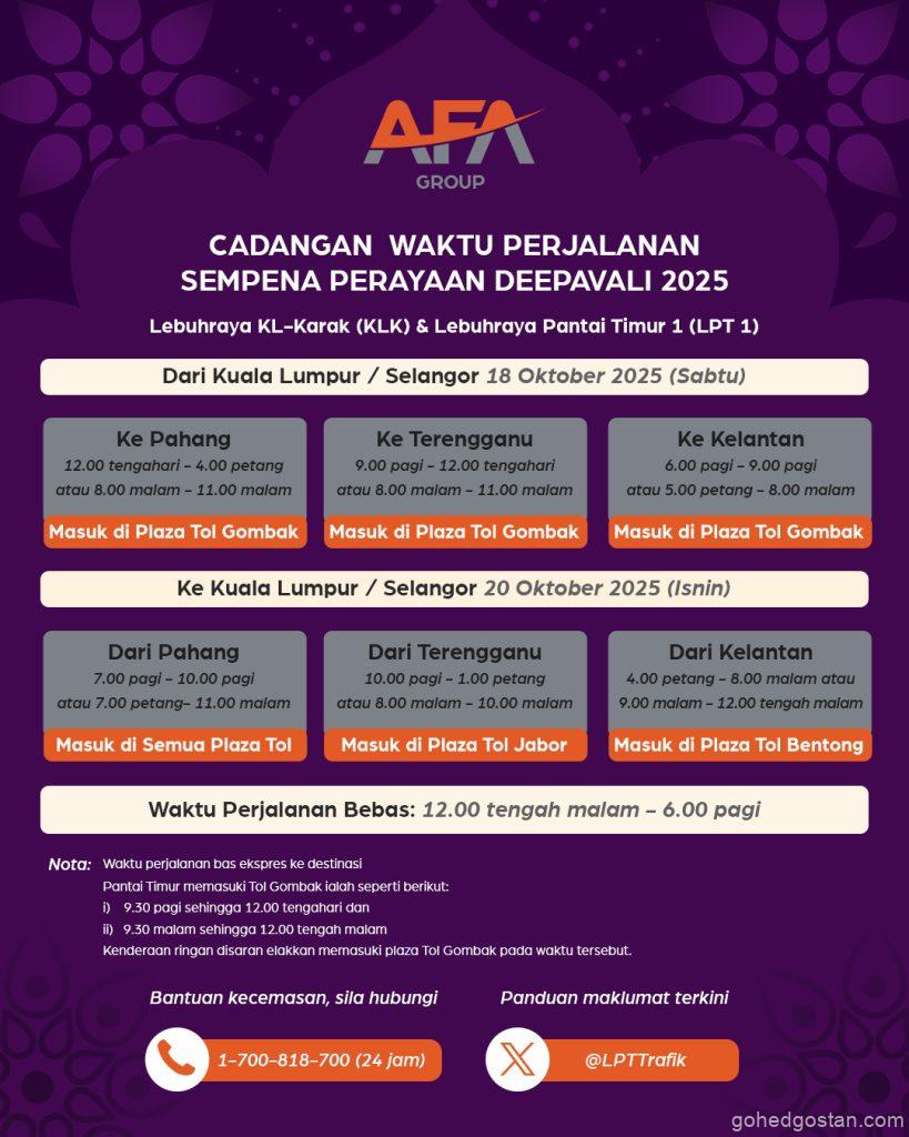 Musim perayaan Deepavali tahun ini bakal menyaksikan lonjakan besar trafik di Lebuhraya Kuala Lumpur–Karak (KLK) dan Lebuhraya Pantai Timur Fasa 1 (LPT1), dengan peningkatan sehingga 59% di KLK dan 67% di LPT1 antara 17 hingga 22 Oktober 2025. Menyedari hakikat itu, AFA PRIME Berhad — dahulunya dikenali sebagai ANIH Berhad — telah melaksanakan pelan menyeluruh bagi memperkukuhkan keselamatan dan pengurusan trafik sepanjang tempoh kritikal ini.