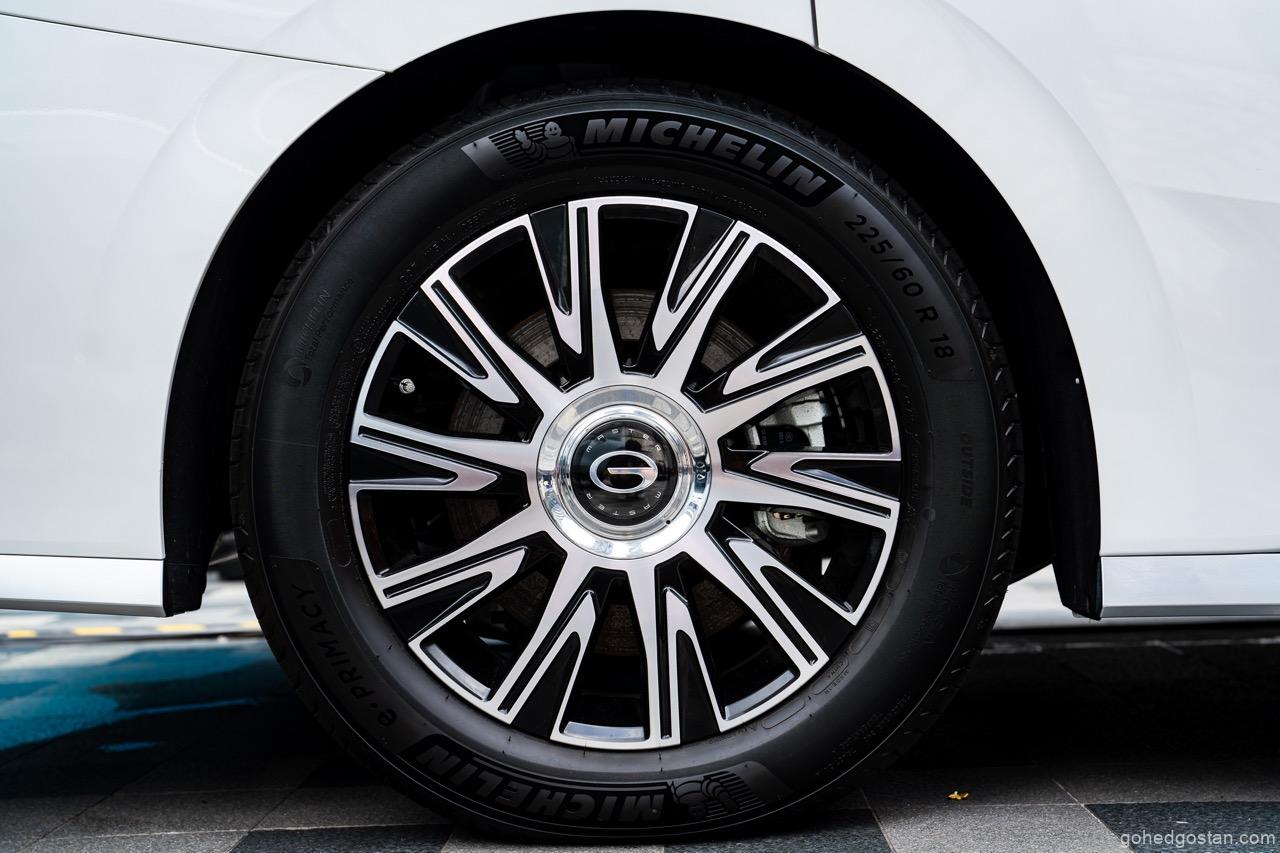 Bahagian luar GAC M8 PHEV menonjol dengan gril besar berinspirasikan “Lion Face” dan lampu utama LED “Awakening Eye” yang garang serta moden. Ia turut dilengkapi rim aloi 18 inci dengan penutup tengah berputar sendiri (self-levelling wheel cap) – satu sentuhan yang biasanya hanya ditemui pada MPV mewah kelas atas.