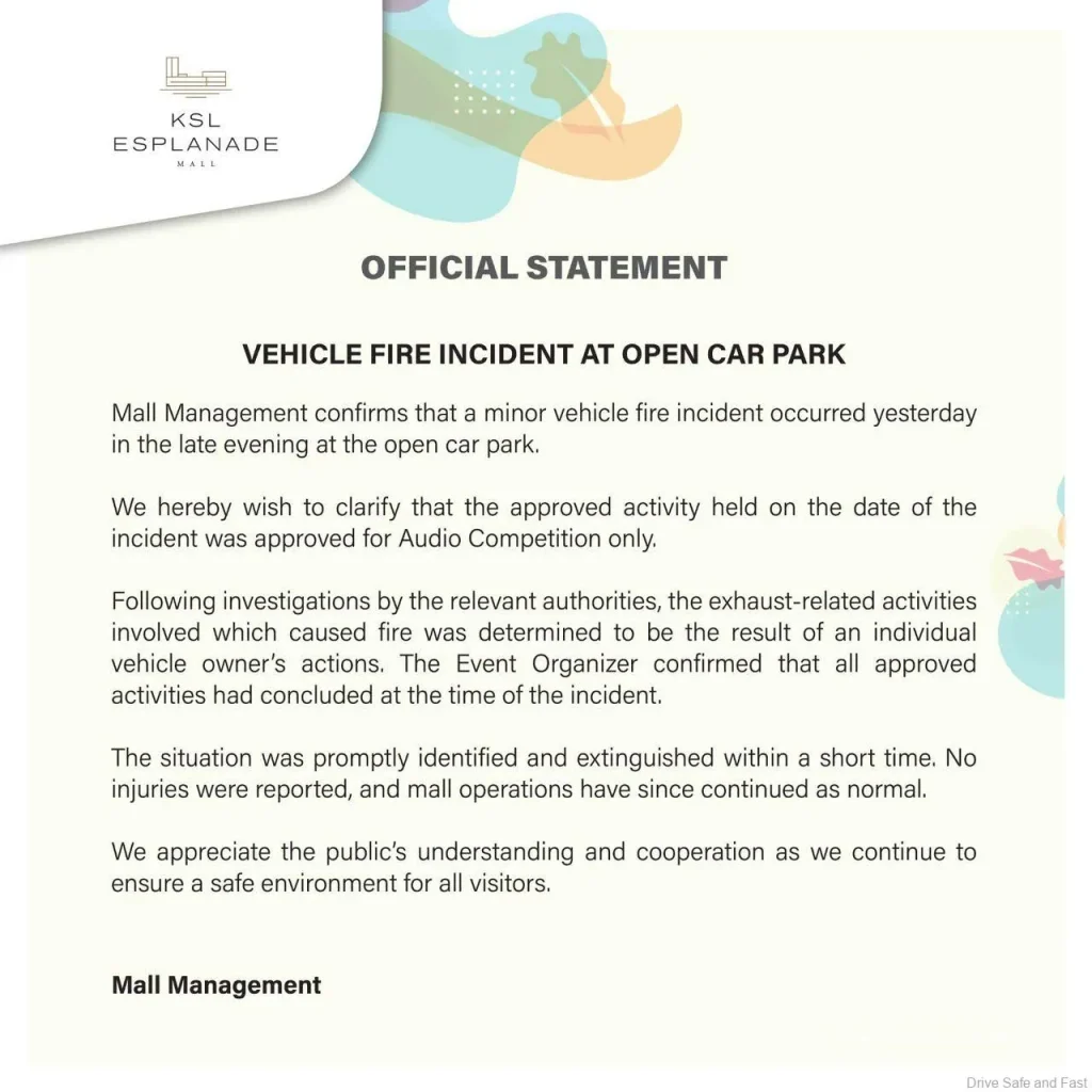 Pengurusan KSL Esplanade dalam kenyataan rasmi memaklumkan bahawa kelulusan yang diberikan hanyalah untuk pertandingan audio, bukan aktiviti berkaitan ekzos atau revving. Mereka menegaskan bahawa insiden berlaku selepas aktiviti rasmi tamat dan disebabkan tindakan individu pemilik kenderaan yang melakukan aktiviti tidak dibenarkan.