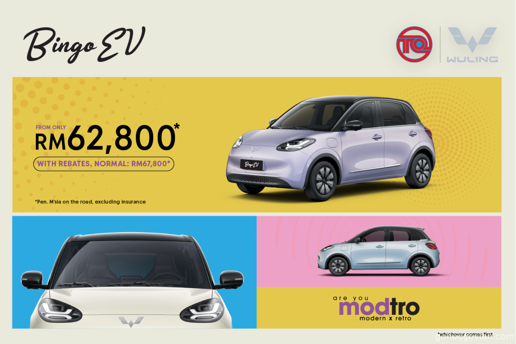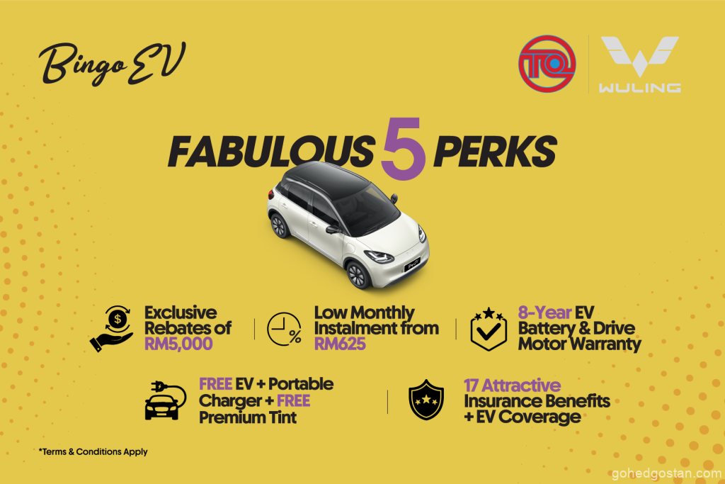 Harga rasmi bermula RM67,800 untuk Bingo PRO dan RM72,800 untuk Bingo MAX. Dengan rebat tunai RM5,000 di bawah Bingo’s Fabulous 5 Perks, harga atas jalan turun kepada RM62,800 (PRO) dan RM67,800 (MAX). Pakej ini turut merangkumi jaminan bateri EV dan motor pemacu selama lapan tahun, jaminan kenderaan lima tahun, serta faedah insurans khusus EV.