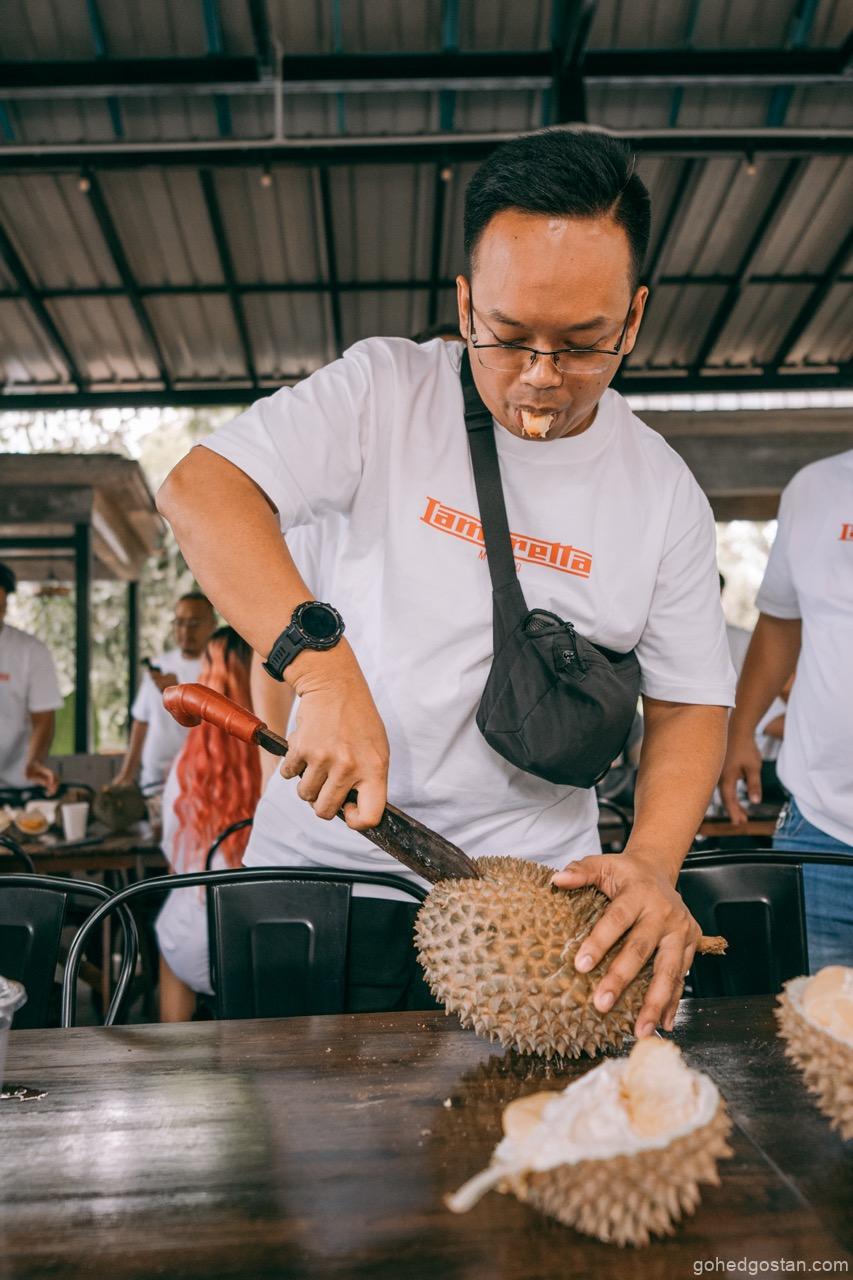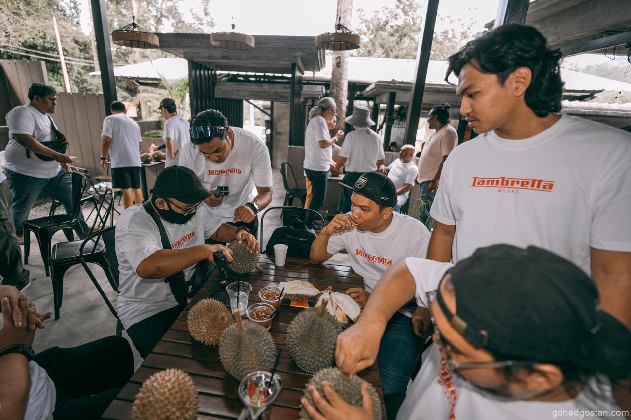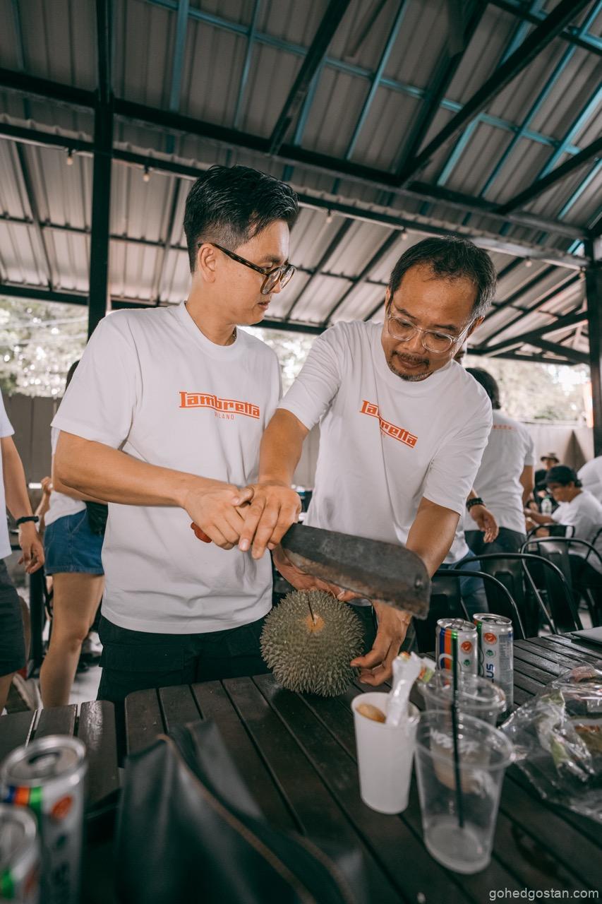 Sorotan awal tentulah sesi durian—Musang King dan Black Thorn. Ia mungkin kedengaran remeh, tetapi dalam konteks acara komuniti, perkongsian seperti ini memainkan peranan penting. Duduk semeja, berkongsi ulas durian, dan berbual tanpa skrip mencipta keakraban yang sukar dicapai dalam acara formal. Di sinilah identiti Lambretta dan juga Thunder Custom sebagai jenama gaya hidup cuba diterjemahkan secara praktikal, bukan melalui slogan.
